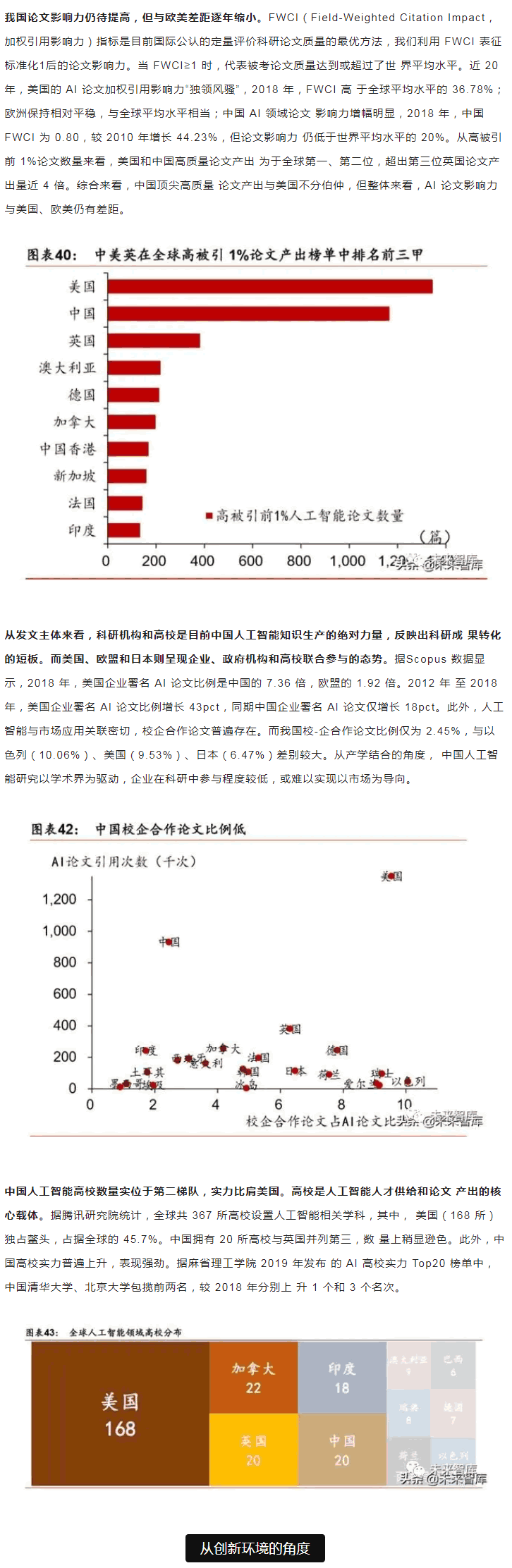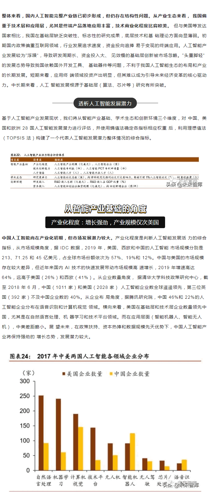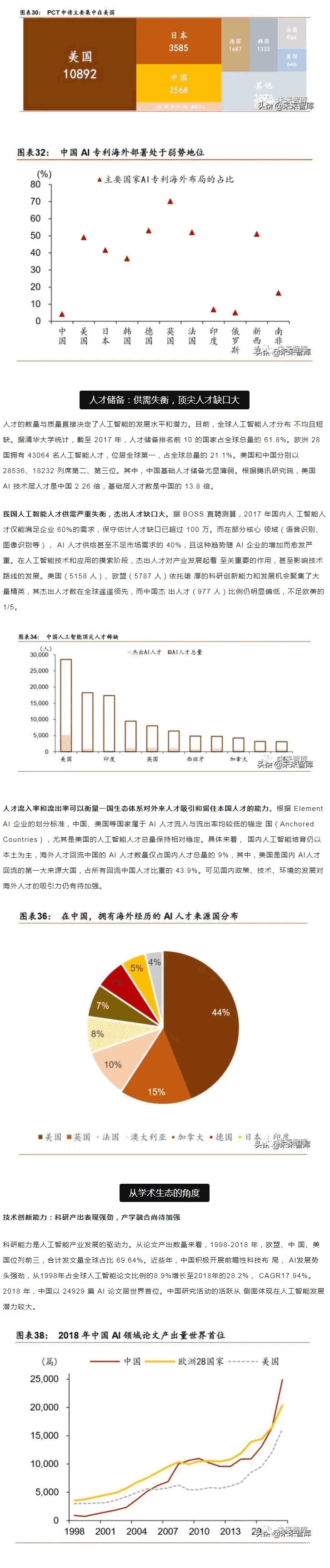 范圍內(nèi),中美“雙雄并立”構(gòu)成人工智能D一梯隊(duì),日本、英國(guó)、以色列和法國(guó)等發(fā) 達(dá)國(guó)家乘勝追擊,構(gòu)成D二梯隊(duì)。同時(shí),在D層設(shè)計(jì)上,多數(shù)國(guó)家強(qiáng)化人工智能戰(zhàn)略布局, 并將人工智能上升至國(guó)家戰(zhàn)略,從政策、資本、需求三大方面為人工智能落地保駕護(hù)。后起之秀的中國(guó),局部L域有所突破。中國(guó)人工智能起步較晚,發(fā)展之路幾經(jīng)沉浮。自 2015 年以來(lái),政府密集出臺(tái)系列扶植政策,人工智能發(fā)展勢(shì)頭迅猛。由于初期我國(guó)政策 側(cè)重互聯(lián)網(wǎng)L域,資金投向偏向終端市場(chǎng)。因此,相比美國(guó)產(chǎn)業(yè)布局,中國(guó)技術(shù)層(計(jì)算 機(jī)視覺(jué)和語(yǔ)音識(shí)別)和應(yīng)用層走在世界前端,但基礎(chǔ)層核心L域(算法和硬件算力)比較 薄弱,呈“頭重腳輕”的態(tài)勢(shì)。當(dāng)前我國(guó)人工智能在國(guó)家戰(zhàn)略層面上強(qiáng)調(diào)系統(tǒng)、綜合布局。