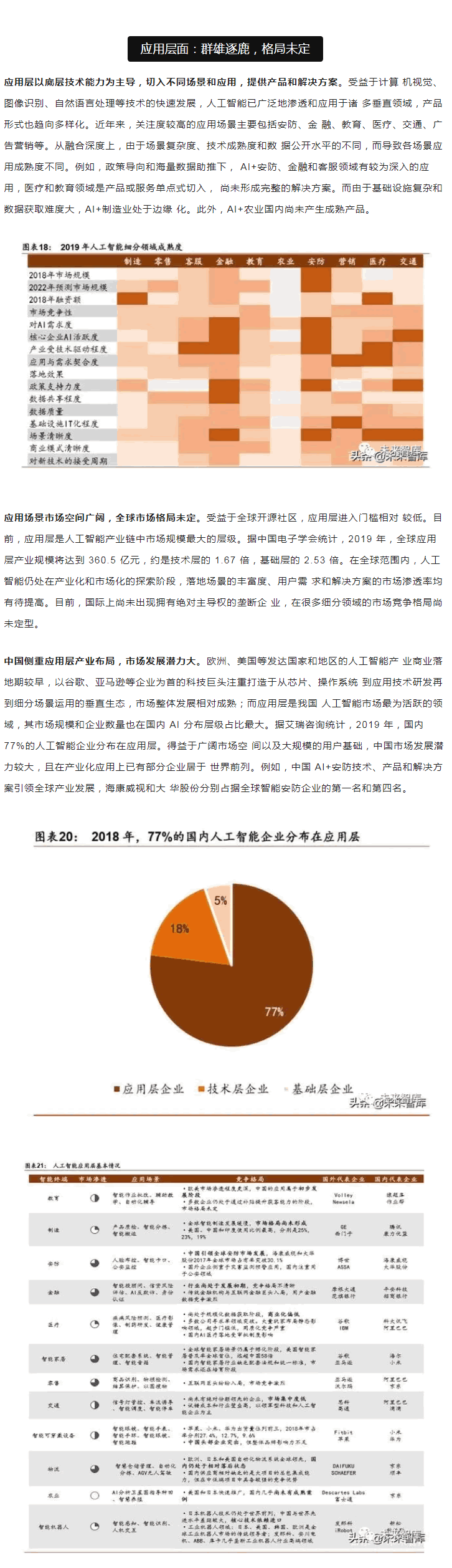 目前,人工智能產(chǎn)業(yè)的生態(tài)系統(tǒng)正逐步成型。依據(jù)產(chǎn)業(yè)鏈上下游關(guān)系,可以將人工智 能劃分為基礎(chǔ)支持層、中間技術(shù)層和下游應(yīng)用層;A(chǔ)層是人工智能產(chǎn)業(yè)的基礎(chǔ),主要提 供硬件(芯片和傳感器)及軟件(算法模型)等基礎(chǔ)能力;技術(shù)層是人工智能產(chǎn)業(yè)的核心, 以模擬人的智能相關(guān)特征為出發(fā)點(diǎn),將基礎(chǔ)能力轉(zhuǎn)化成人工智能技術(shù),如計(jì)算機(jī)視覺(jué)、智 能語(yǔ)音、自然語(yǔ)言處理等應(yīng)用算法研發(fā)。其中,技術(shù)層能力可以廣泛應(yīng)用到多個(gè)不同的應(yīng) 用L域;應(yīng)用層是人工智能產(chǎn)業(yè)的延伸,將技術(shù)應(yīng)用到具體行業(yè),涵蓋制造、交通、金融、 醫(yī)療等 18 個(gè)L域,其中醫(yī)療、交通、制造等L域的人工智能應(yīng)用開(kāi)發(fā)受到廣泛關(guān)注。