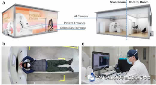 人工智能成像工作流程:許多現代的X光和CT系統都配備了用于病人監護的攝像機。在COVID-19爆發期間,這些設備促進了非接觸掃描工作流程的實施。技術人員可以通過攝像機的實時視頻流從控制室監控病人。在這種情況下,人工智能能夠通過從視覺傳感器獲取的數據中識別患者的姿勢和形狀來自動執行操作,以確定佳掃描參數。這樣的自動化工作流程可以顯著提G掃描效率并減少不必要的輻射暴露。一個顯著的例子是基于由可視人工智能技術支持的移動CT平臺自動掃描工作流,如圖1(a)所示。移動平臺完全獨立,帶有基于人工智能的預掃描和診斷系統。它被重新設計成一個完全隔離的掃描室和控制室,以避免技術人員和患者之間不必要的互動。進入掃描室后,通過視覺和聽覺提示,指示患者在病床上擺好姿勢(圖1(b))。技術人員可以通過窗戶觀察,也可以通過掃描室內安裝在天花板上的人工智能攝像機傳輸的實時視頻,并在必要時校正病人的姿勢(圖1(c))。患者定位算法將從用照相機[1]捕獲的圖像中自動恢復患者的3D姿態和完全重建的網格。基于3D網格,患者目標身體部分的掃描范圍和3D中心線都被估計并轉換成控制信號和優化的掃描參數,以供技術人員驗證。一旦核實,病床將自動對準ISO中心,并移入掃描架進行掃描。采集到CT圖像后,將對其進行處理和分析,以便進行篩查和診斷。2、AI圖像增強在COVID-19中的具體應用