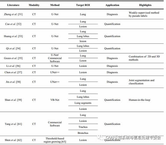 此環節的作用在于,對疑似患者肺部區域拍攝而得到的圖像進行預處理,以提供后續操作。實施層面,此環節包含兩部分工作:肺部區域劃分和損傷區域。表1是一些圖像劃分在COVID-19應用中的研究匯總。