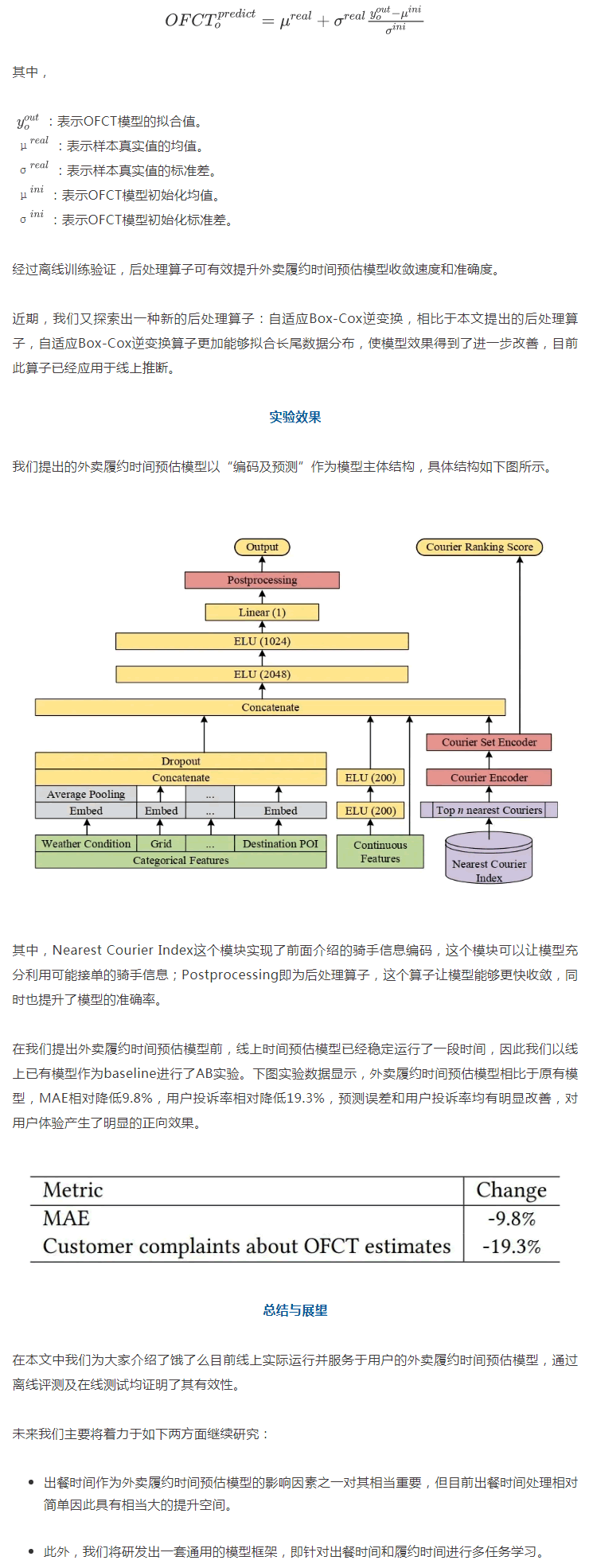 外賣履約時(shí)間預(yù)估(OFCT:Order Fulfillment Cycle Time)問題相比一般的時(shí)間預(yù)估問題而言更為復(fù)雜,其中存在餐廳與用戶的供需關(guān)系、餐廳出餐時(shí)間的未知性以及騎手行為的不確定性等問題。在論文中我們向?qū)W術(shù)界首次詳細(xì)介紹外賣履約時(shí)間預(yù)估這一問題,并給出了有效的解決方案,后得到了審稿人的一致認(rèn)可。