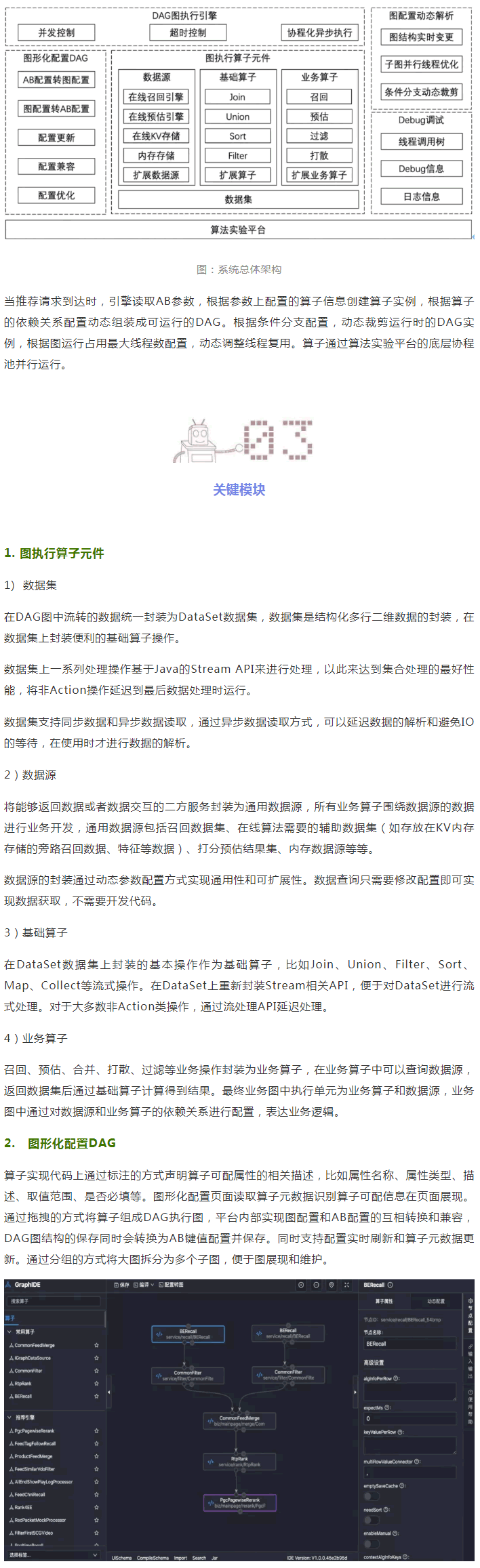 系統(tǒng)總體結(jié)構(gòu)如下圖所示:分成五個主要的模塊(圖執(zhí)行算子元件、圖形化配置DAG、圖配置動態(tài)解析、DAG圖執(zhí)行引擎、Debug調(diào)試)。