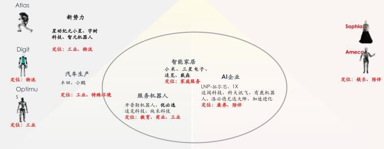 體能型以美國波士頓動力的Atlas、 Agility的Digit、特斯拉Optimus為代表;智能型以香港Hanson Robotics的Sophia以及英國Engineered Arts的Ameca為代表;