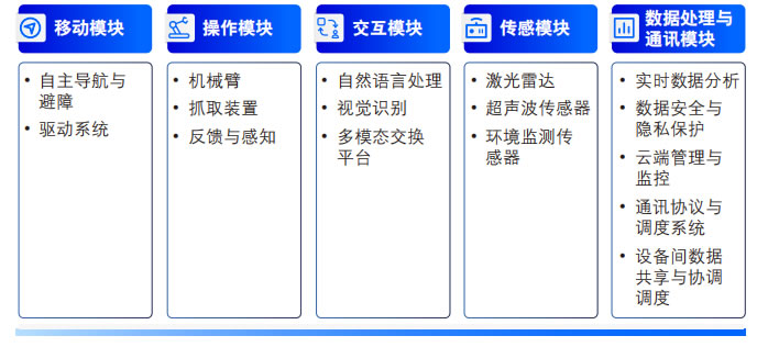 模塊化設(shè)計(jì)通過(guò)將機(jī)器人系統(tǒng)分解為多個(gè)軟硬 件模塊 ,廠商和用戶可以根據(jù)不同的應(yīng)用需求 進(jìn)行靈活組合和定制。這一設(shè)計(jì)理念不僅提升 了產(chǎn)品的適應(yīng)性和可擴(kuò)展性 ,還為技術(shù)的創(chuàng)新 與產(chǎn)品的迭代提供了可能性 ,是開(kāi)放性的全棧 式智能服務(wù)機(jī)器人生態(tài)系統(tǒng)的基石。服務(wù)機(jī)器 人模塊化設(shè)計(jì)以多個(gè)軟硬件模塊——移動(dòng)模 塊、操作模塊、交互模塊、傳感模塊和數(shù)據(jù)處 理與通信模塊為核心。通過(guò)這種靈活的設(shè)計(jì), 服務(wù)機(jī)器人能夠大大提升在不同場(chǎng)景中能夠靈活應(yīng)對(duì)復(fù)雜任務(wù)的能力。