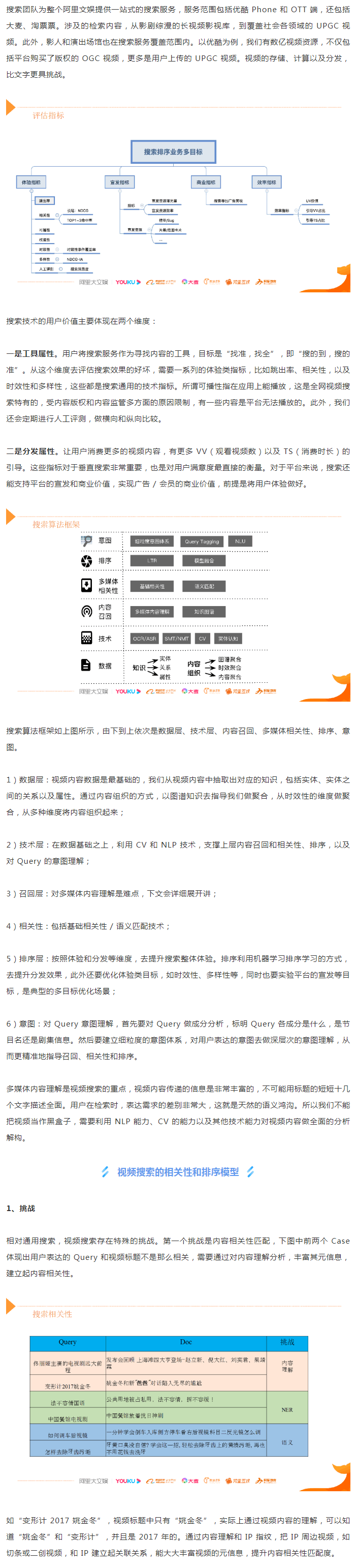 考慮到大家來自不同的業(yè)務(wù)L域和技術(shù)方向,我會先簡單介紹優(yōu)酷視頻搜索的業(yè)務(wù)背景,同時快速介紹搜索的基本評估指標(biāo)、搜索系統(tǒng)的算法框架以及相關(guān)性和排序模型,讓大家對視頻搜索有一個更多面的認(rèn)識,后面重點(diǎn)介紹多模態(tài)視頻搜索相關(guān)技術(shù)。