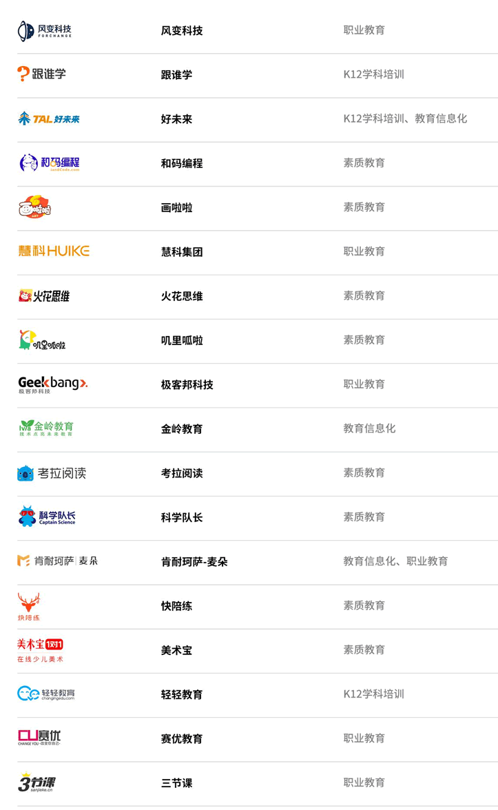 掌門(mén)教育、好未來(lái),新東方在線、說(shuō)客英語(yǔ)、猿輔導(dǎo)、跟誰(shuí)學(xué),有道,大米網(wǎng)校,作業(yè)幫,輕輕教育,51talk,愛(ài)樂(lè)奇,悉之教育,卓世未來(lái)