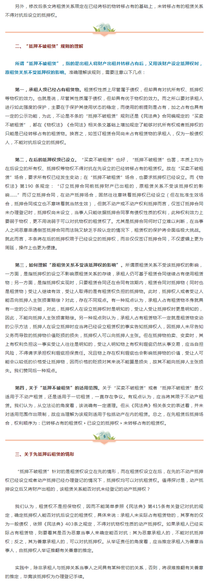 對比《民法典》第405條修改后的條文,在堅持“抵押不破租賃”原則的基礎上,修改后條文明確了抵押對抗租賃權時,須抵押權已經設立,而并非僅僅“訂立抵押合同”,在《物權法》第190條的意思,對抗租賃權僅需訂立抵押合同,實際上,抵押合同的訂立并不意味著抵押權的設立。