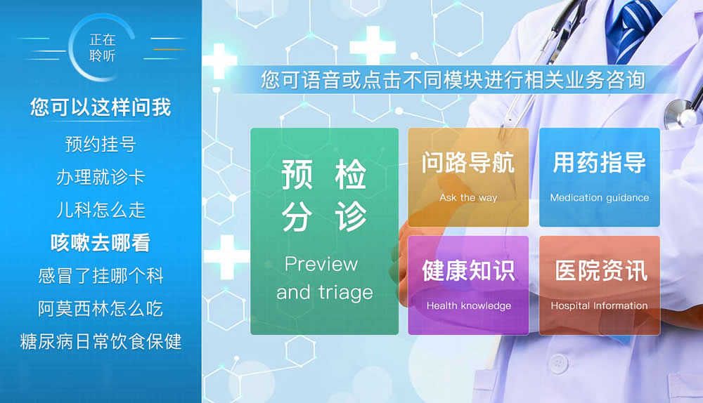 智能導診機器人開發初衷是解決門診導 醫人數較少、重復問答較多的現實情況。在醫院業務G峰期人滿為患的情況下,醫院智能導診機器人可以及時響應,可以指導患者就醫、引導分診,同時向患者可以介紹醫院就醫環境、門診就診流程和醫療保健知識等。 導診機器人通過語音識別、語音合成和自然語言理解等技術,支持語音、觸控、圖像等多種交互方式,改善就醫體驗,提G醫療服務質量,是醫院智慧醫療的重要組成部分和具體體現。 |