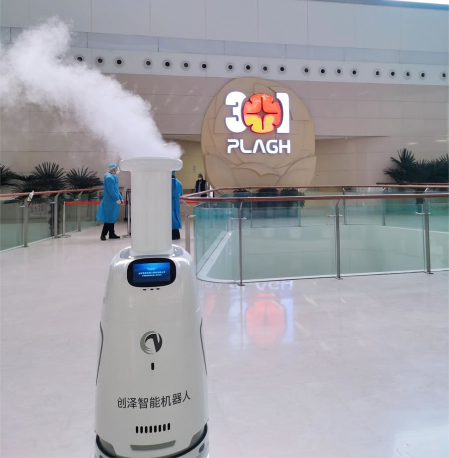 在中國人民解放軍總醫院D一醫學中心的門診大廳里,創澤智能消毒機器人,頭D噴霧在醫院門診大廳走來走去進行全域消毒殺菌。
