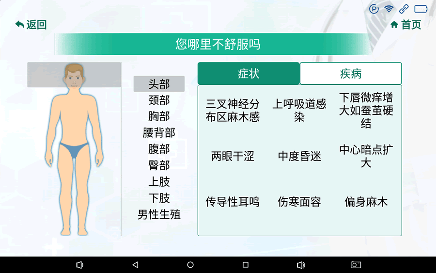 2.進(jìn)入癥狀疾病選擇頁(yè)面,選擇哪里不舒服或直接選擇疾病名稱(chēng)進(jìn)行導(dǎo)診;